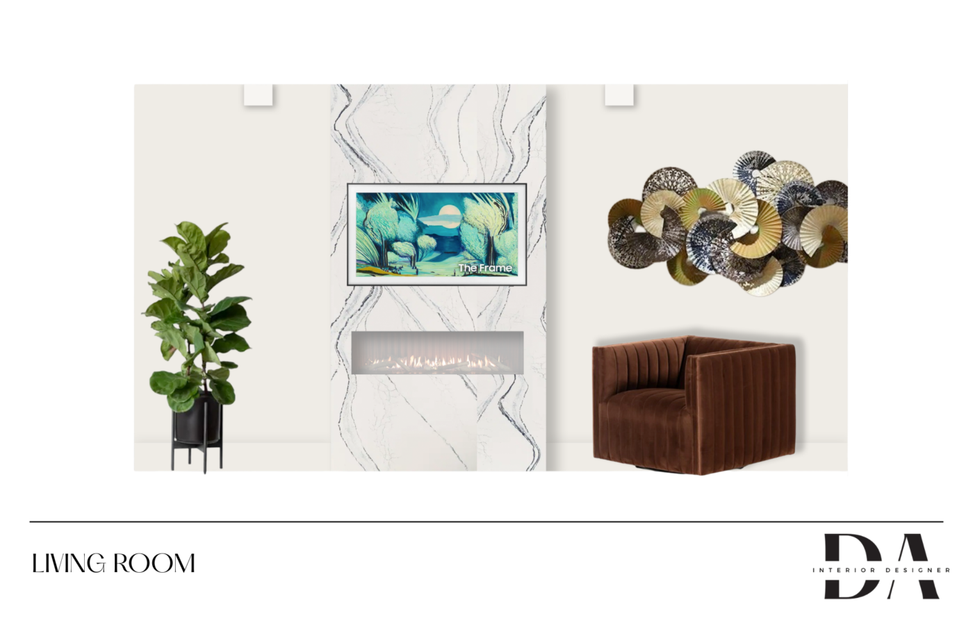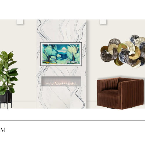A modern living room centered around statement artwork, blending luxury materials with an eclectic mix of textures. Rich velvet seating, sculptural décor, and warm wood accents create a space that feels both curated and comfortable. Intentional lighting, custom feature detailing, and layered material selections echo the artwork’s bold energy while supporting everyday living.