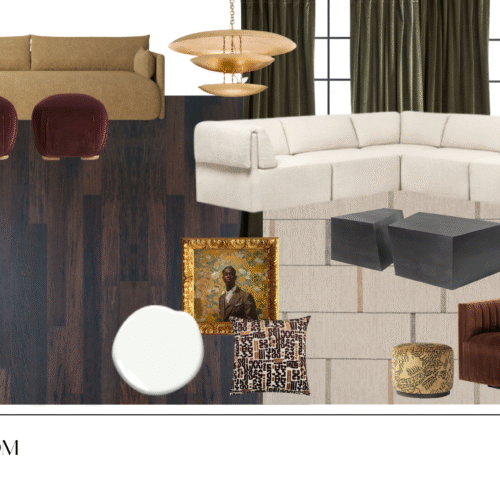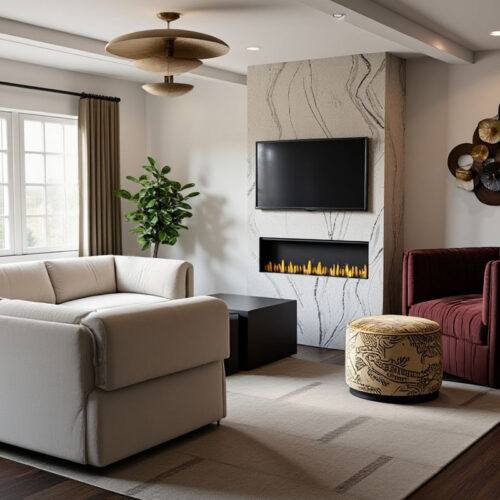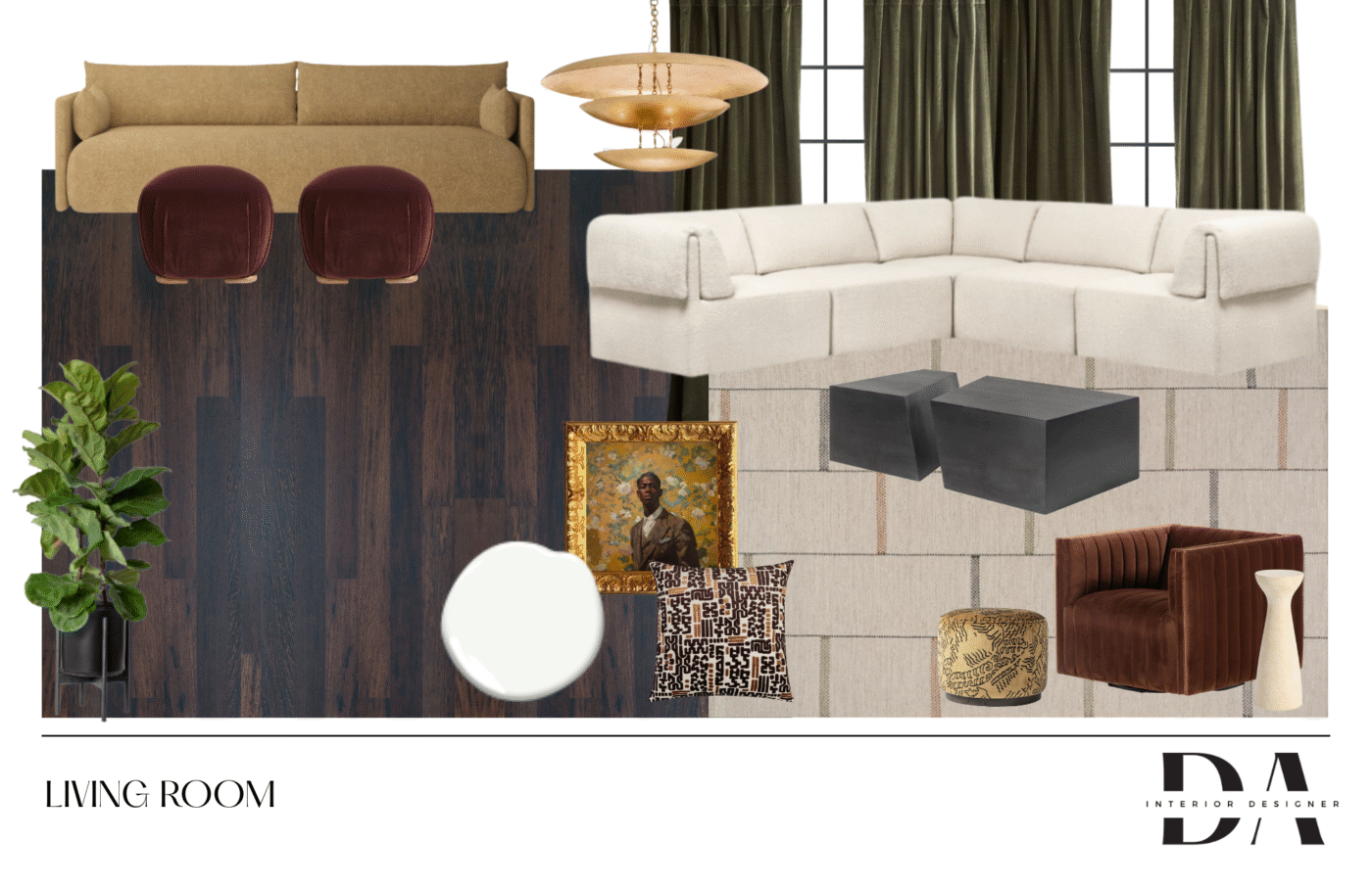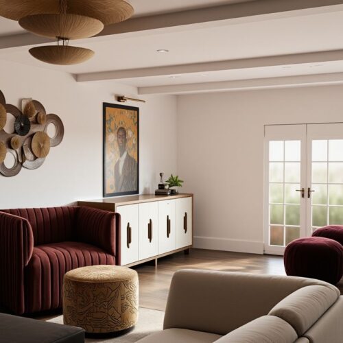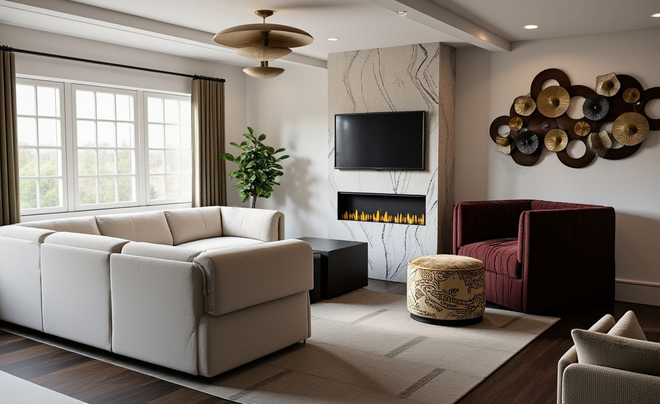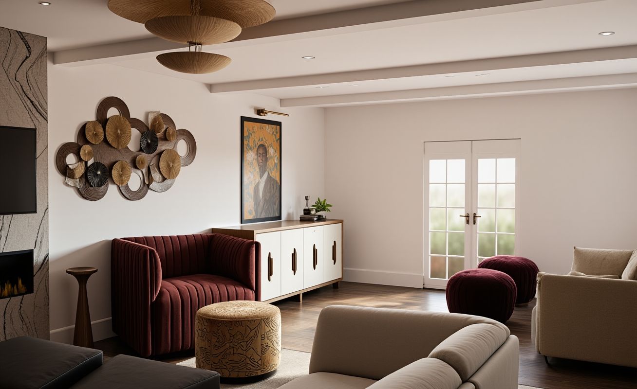 This modern living room design blends luxury materials with an eclectic mix of textures, all inspired by the statement artwork at its center. Rich velvet seating, sculptural décor, and warm wood accents create a space that feels both curated and contemporary. Every detail from the organic wall installation to the layered lighting was chosen to echo the artwork’s bold energy. The result is a sophisticated, art-inspired interior that brings character, comfort, and modern elegance together in one cohesive living space.