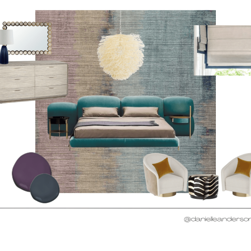 I created a vibrant mood board for a playful bedroom, featuring a blue bed paired with wallpaper and paint accents that bring in some purple. The design balances bold color and pattern to inspire a lively, cohesive, and memorable space.